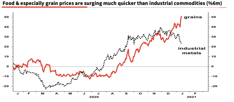 Abbildung 10: Food & especially grain prices are surging much quicker than industrial commodities (%6m); Society General, Business Insider